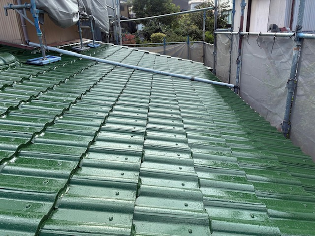 屋根の上塗り作業中ですが、膜厚になり、ツヤが高まり鮮やかな色になっています。