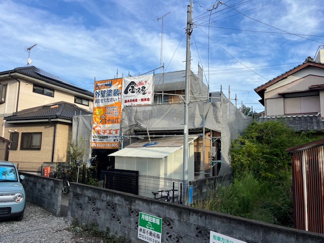 塗料の飛散防止するための、メッシュシートを取りつけます。